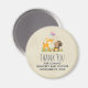 à event / party thank you magnet with a cute illustration featuring a baby deer and a little squerrl holding an acorn and a butterfly flying above their heads. These adorable woodland creobjets on standing on some grass with some whimsical mushrooms by their feet Background est sur image of light brown parchment/kraft paper.