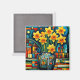 A.I. a créé l'interprétation d'un bouquet vibrant de jonquilles jaunes se distingue sur un fond de formes géométriques surréalistes et de couleurs audacieuses. Le vase aux motifs complexes abrite les fleurs.