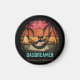 Aimant Tropical Escape Circle du Cool Daydreaming : Un chat noir portant des lunettes de soleil et une chemise hawaïenne, se reposant dans un hamac entre deux palmiers, avec un coucher de soleil rétro dans l'arrière - plan.