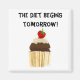 Un frigo magnet blanc carré avec un succulent cupcake au chocolat, garni de crème et de fraise, réalisé à partir d'un collage en papier peint à la main par Judy Adamson. Au-dessus du cupcake se trouvent les mots "La diète commence demain !". Un aimant frigo pour tester la résolution de n'importe quel diètre! Le cupcake au chocolat est également disponible sur une carte de voeux et sur un T-shirt à sangle pour dames.
