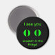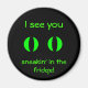 C'est un aimant rond de frigo noir avec les yeux vert néon dessus et les mots "Je vous vois, en vous faufilant dans le frigo !" Amusement goth mignon qui se marie bien avec Halloween. Il faut garder le contrôle avec toutes ces petites douceurs sombres.