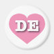 Cet aimant est doté d'un coeur rose vif contenant les lettres coques supérieures, blanches et audacieuses DE, l'abréviation officielle du Delaware, le premier état.