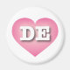Cet aimant présente un coeur rose cool et calme avec un centre blanchi contenant les lettres coques supérieures blanches en gras DE, l'abréviation officielle de l'état du Delaware, le premier état.