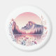 Illustration fantaisiste de la Demi-Dôme de Yosemite, encadrée par des fleurs sauvages et un lac réfléchissant.