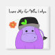 Un joli hippo de dessin animé portant un casquette noir.... un grand dicton accentue cet hippopotame à pois pourpre.