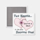 Quelle belle façon d'annoncer vos plans mariages à venir, avec ces magnets doux. Graphiques rustiques primitifs de deux coeurs roses cousus ensemble, avec une fleur, au milieu. Texte graphique, en haut et en bas, Deux Coeurs.... Deviens Un ! Le texte bleu de la date et des noms est entièrement personnalisable pour répondre à vos besoins.