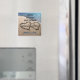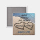 Belle photographie originale de deux coeurs, dessinée dans le sable le long de l'eau bleue de l'océan pour signifier amour et romantisme. Insérez facilement la date du grand jour spécial et mettez vos noms personnalisés dans le coeur pour personnaliser. Grand concept pour le prochain mariage de destination de plage d'été Enregistrer la date, ou facilement changer le texte pour remercier les faveurs de la fête, etc. Un aimant unique, en forme de carré personnalisé, garde pour vos invités.