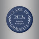 L'emblème de typographie classique blanc sur fond bleu marine indique : CLASS OF [YEAR] GRADUATE avec les mots incurvés autour de l'année et le nom de votre diplômé ou de votre école au milieu avec des feuilles botaniques incurvées le long de chaque côté du design circulaire. Personnalisez l'année et le nom dans la barre latérale. Fait un cadeau de fin d'études amusant.