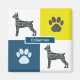 Doberman Pinscher silhouette jaune, bleu et noir lignes de grille abstrait motif. Les empreintes de pattes alternant avec la silhouette du chien font un motif cool. Vous pouvez personnaliser avec votre nom de chien ou simplement quitter la race.