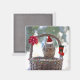 Photo d'un mignon écureuil portant un chapeau de Père Noël assis sur un panier orné d'un arc de Noël rouge et d'un bas de Noël rouge et vert alors que la neige tombe tout autour d'elle. On peut voir des boues vertes d'un arbre à feuillage persistant dans l'arrière - plan et la neige s'empile. Une jolie photo d'écureuil pour vous aider à célébrer Noël !