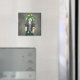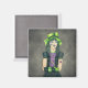 Cet aimant a une fille à l'allure gothique assez éffrayante avec un tatouage en toile d'araignée sur son visage dans un casquette vert néon et robe noire et violette sur un arrière - plan gris clair.