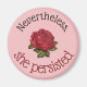 Ce design vintage chic présente les mots "Néanmoins elle a persisté" en noir et rouge dans la typographie populaire contre un arrière - plan rose pâle. Au centre du design se trouve un rose vintage rouge. Ce design fait un grand cadeau d'encouragement et d'inspiration pour vous-même ou une femme ou une fille importante dans votre vie.