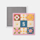 Personalize this quilt block patterned fridge magnet with your monogram. It's printed with realistic looking embroidered flowers, lace and button details and a monogram in the center. Just edit your letter in the easy Zazzle editor with the "personalize" button.