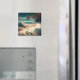 Eau turquoise et palmiers sur un aimant d'art de plage de sable blanc. Citation : "En amour avec la mer."