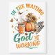 Design paisible et coloré avec une scène automne/automne avec un citrouille, tasse de café, papillons et fleurs automne. Le texte inspirant et coloré dit : "Dans l'attente Dieu fonctionne". Ce design est disponible sur une grande variété de produits.