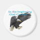 "Au début, Dieu Créé" en gras texte bleu superposé sur un aigle chauve en vol.