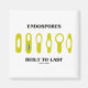 Une endospore est une structure dormante, dure et temporairement non reproductrice produite par certaines bactéries du phylum Firmicute. Les endospores permettent la survie d'une bactérie pendant des périodes de stress de l'environnement qui peuvent dernier des millions d'années. Montrez votre sens de l'humour bactérien avec n'importe lequel de ces cadeaux présentant différents types d'endospores, ainsi que le dicton "Endospores construites à Dernier"! Cadeaux mémorables pour les microbiologistes !