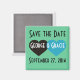 Cet aimant à frigo Save the Date présente côte à côte des coeurs noirs et turquoise sur un arrière - plan turquoise clair, recouvert de texte modèle pour les noms de la mariée et du marié. Les mots "enregistrer la date" apparaissent au-dessus du coeur, et la date apparaît ci-dessous. Le design peut être customisé pour une fête de fiançailles, une douche nuptiale, un dîner de répétition, un mariage, un anniversaire ou la fête de la Saint-Valentin, sauf la date ou la faveur de la fête.