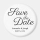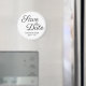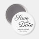 Un enregistrez l'aimant invitation de date avec un style calligraphie agréable. Customisez les couleurs de police blanc arrière - plan et noir. Un aimant rond moyen pour enregistrer les dates.