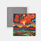 Une représentation vive et colorée d'une éruption volcanique domine la scène avec un ciel étoilé tourbillonnant et des coulées de lave stylisées. Au premier plan, une rivière sinueuse serpente à travers un paysage parsemé d'arbres arrondis et de collines ondoyantes, tandis qu'un ciel dynamique tourbillonne au-dessus de motifs audacieux