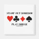 Vous ennuyez-vous ? Avez-vous appris à jouer au bridge pour étouffer votre ennui ? Montrez l'attitude de pont ciré avec l'un de ces ponts disant des cadeaux avec les quatre costumes de carte (coeur, club, diamant, pique) ainsi que le truisme de pont disant "Stamp Out Ennemi Jouer Pont". Offrez des conseils à d'autres pour ceux qui recherchent un passe-temps pour étouffer l'ennui avec l'un de ces inoubliables cadeaux d'humour de pont!