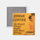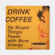 Femme souriante avec rouge à lèvres rétro et ongles boit sa tasse de café du matin. La légende dit : "Buvez du café - Faites des choses stupides plus vite avec plus d'énergie."