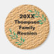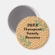 Créez une conservation peu coûteuse pour votre prochaine réunion de famille avec ces magnets uniques. L'année et le nom de votre famille apparaissent au centre de cet aimant rond de réfrigérateur. Le texte est entouré de branches d'arbres avec des feuilles vert vif. L'arrière - plan brun ressemble à un panier tissé ou un motif de terre fêlé. Tous les textes peuvent être facilement personnalisés pour votre grande réunion de famille.