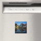 Aimant photo souvenir avec une maison traditionnelle en bois utilisée comme ferme à fromage en peinture verte avec carreaux rouges avec réflexion dans l'eau au début de la nuit au crépuscule dans le musée Zaanse Schans en Hollande avec le texte 'Zaanse Schans, Pays-Bas'.