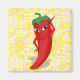 Un personnage de dessin animé rouge et piment chaud. Design original avec un motif de dentelle dorée (imprimé jaune) en arrière-plan.