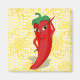 Un personnage de dessin animé de poivre rouge et chaud. Design original avec un motif de dentelle dorée (imprimé jaune) en arrière-plan.