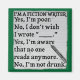 Si vous êtes un écrivain / auteur de fiction, vous avez probablement entendu toutes les questions répondues sur cette drôle de conception de papier. Maintenant, vous pouvez gagner du temps à discuter avec les crétins qui posent ces questions ineptes en affichant les réponses sur cet aimant. Cela signifie plus de temps pour vous de vous cacher dans votre fauteuil de bureau, en écrivant des personnages bourdonnants basés sur ces buffets. L'aimant montre une page de carnet grisâtre et un stylo avec ces mots : Je suis un écrivain de fiction. Oui, je suis pauvre. Non, je ne voudrais pas avoir écrit "___". Oui, je sais que personne ne lit plus. Non, je ne suis pas saoul. Il est également disponible dans la section "Funny Etc" de notre magasin avec "not" croisé dans la dernière phrase... en coque vous êtes ivre. VOUS POUVEZ ÉGALEMENT VOUS Y RENDRE SUR UN PAPIER JAUNE. La couleur Arrière - plan est personnalisable.