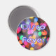 Aimant rond avec une image de lumières disco de couleur arc-en-ciel et les mots "Fièvre disco" en lettrage clair et violet foncé. Voir la collection d'aimants Disco les années 70 dans TOUCHES SPÉCIALES | Section Favoris.