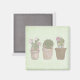 Aimant avec un design fantaisiste. 3 cactus mignons tous dans une rangée avec des visages souriants assis dans un pot à fleurs chacun portant des bijoux.