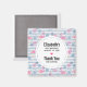 Un aimant pour anniversaire avec un motif avec une ambiance estivale amusante. Flamants roses et ananas posés sur un motif rayé bleu clair avec feuilles et coeurs tout autour.
