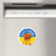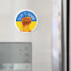 Montrez votre soutien à l'Ukraine avec cet aimant frigo avec découpe ronde du drapeau ukrainien avec poing flamboyant et "Gloire à l'Ukraine", l'un des slogans les plus populaires du pays, en texte courbe.