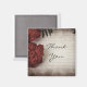 Un aimant en plastique avec une photo à thème floral d'automne. Papier à écritures recouvert d'une doublure défraîchie avec quelques jolies fleurs rouges et des feuilles verts placés sur les bords. Le texte dit merci dans une police manuscrite soignée.