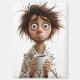 Illustration fantaisiste et relatable d'un homme débraillé en peignoir serrant une tasse de café aux yeux larges et fatigués. Ses cheveux désordonnés et son expression perplexe capturent parfaitement le chaos des premiers matins avant que la caféine ne prenne effet.