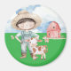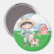 Aimant avec garçon, veau et grange rouge sur la pelouse verte. Disponible en trois tailles.