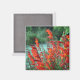 Une photo de fleurs de gladiolus flambant de couleur. Des fleurs rouges-orangées aux accents jaunes recouvrent les tiges des plantes. La faible profondeur de champ donne à l'arrière - plan vert un aspect peintre. 35 mm, couleur.