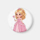 Jolie princesse chibi avec robe rose brillante, couronne de parties scintillant, cheveux blonds à flot, tenant une baguette pétillante, contour d'autocollant brillant.