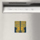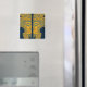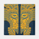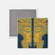 Une paire de masques d'inspiration aztèque se font face l'un à l'autre, créant l'apparence d'un troisième masque tourné vers l'avenir. Les lignes et les cercles complexes sont peints d'une couleur jaune doré qui est mise en surbrillance pour produire une brillance subtile sur la surface. L'intérieur et l'arrière - plan de l'image est fini avec des teintes bleues profondes qui descendent au milieu du design entre les deux masques. Le recadrage serré de l'image crée un motif agressif qui se démarque vraiment sur cet aimant. Cet élégant design aztèque a l'air d'être un artefact ancien avec une atmosphère moderne.