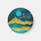 Paysage montagnard Abstrait aux tons audacieux d'or, de cyan et de bleu avec un lever de lune, des étoiles et des oiseaux.
