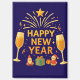 Celebrate the New Year with this warm golden festive illustration featuring Santa figures, gifts, shining stars, and elegant party elements. A bright and joyful design that adds a magical touch to every New Year celebration
