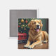 A nostalgic and tender Christmas painting of a Golden Retriever watching a toy train beneath the Christmas tree. A timeless holiday artwork that brings warmth and joy to any home.
