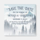 Une mystérieuse forêt grise accentuée d'un brouillard blanc romantique autour des pins et de la montagne dans l'arrière - plan font une grande nature sauvage Save the Date aimant pour une cérémonie d'hiver dans les montagnes. La typographie élégante présente tous les casquettes avec une belle signature fleurit sur les lettres majuscules.