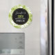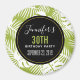 Aimant d'anniversaire avec un motif répétitif de grands feuilles de palmiers sur un arrière - plan vert olive. Moderne tendance et tropical. Un cercle noir avec une bordure intérieure dorée superposée avec vos détails personnalisés à l'intérieur.
