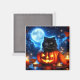 L'aimant est présenté avec une impression d'art Halloween d'un chat noir assis dans la citrouille.