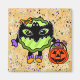 Joli cornichon de vacances tout décoré d'un masque de chauve-souris portant un seau à bonbons citrouille d'Halloween.