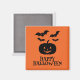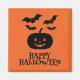 Illustration d'une silhouette noire de citrouille souriant et de chauves-souris volantes qui vous accueillent un Halloween heureux sur un arrière - plan orange. Une idée de cadeau pour les amateurs d'halloween, les amateurs éffrayants, les amateurs de chauves-souris et de films d'horreur.
