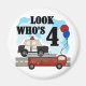 Un croiseur de police, un moteur de pompiers, des ballons et un texte qui dit "Regardez qui est 4" est présenté sur notre design quotidien Héros 4th Birthday.